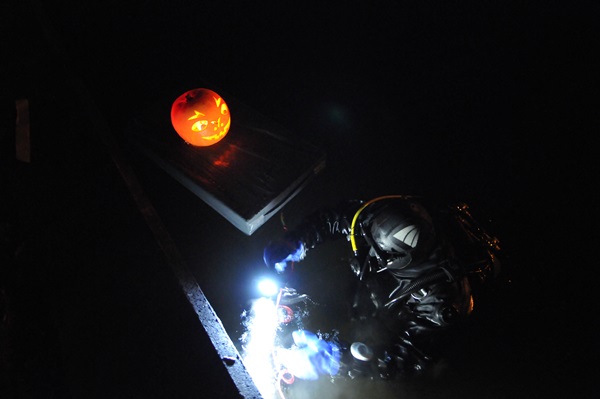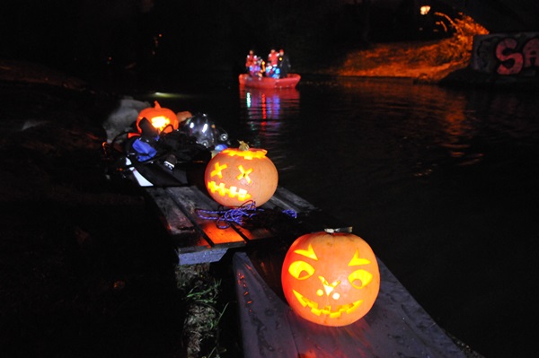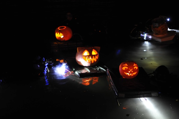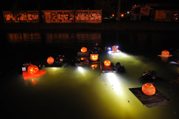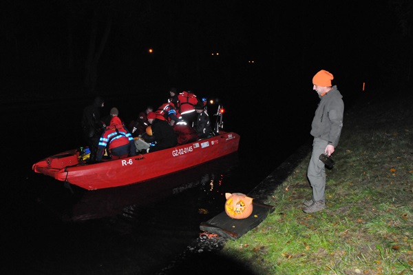 Najpierw musieliśmy przygotować nasze oryginalne boje sygnalizacyjne, zorganizować do nich podświetlenie oraz zagwarantować ich pływalność. I to było najłatwiejsze, właściwie drążenie dyni to sama przyjemność. Spotkaliśmy się zgodnie z planem przy rondzie Andrzeja Balona Tarasiewicza. W tym roku również zgodnie z planem weszliśmy do wody. I tu dopiero zaczęła się zabawa. Na powierzchni w fleszach aparatów licznie przybyłej na rozpoczęcie akcji publiczności wszyscy byliśmy uśmiechnięci. Jednak wystarczyło pierwsze 100 metrów i już wszyscy wiedzieli, że IV Mazurska Mila Nocą długo nie da o sobie zapomnieć… Lekki na pozór prąd wody w kierunku Niegocina pod mostem kolejowym sprawił, że po jego pokonaniu wszyscy byli naprawdę rozgrzani. Dobrze rokująca na starcie woda za sprawą instalacji odprowadzającej opady deszczu za mostem kolejowym przypominała rozcieńczone mleko. Jeszcze gorzej mięli nurkowie którzy płynęli z tyłu. I właśnie ten odcinek pomiędzy mostami kolejowym a obrotowym można by nazwać rozgrzewką dla ducha… Na tych którzy nie dali się pokonać prądowi i przejrzystość za mostem obrotowym czekała już coraz lepsza woda i ostatnie 1300 metrów pod wodą;-) Wszystkim, którzy zechcieli nam towarzyszyć dziękujemy. Za profesjonalną asekurację i zabezpieczenie ratownicze imprezy Mazurskiemu Ochotniczemu Pogotowiu Ratunkowemu – bardzo dziękujemy. Nurkom, którzy podjęli wyzwanie Gratulujemy – macie moc chłopaki! W tegorocznej edycji udział wzięło 12 śmiałków.