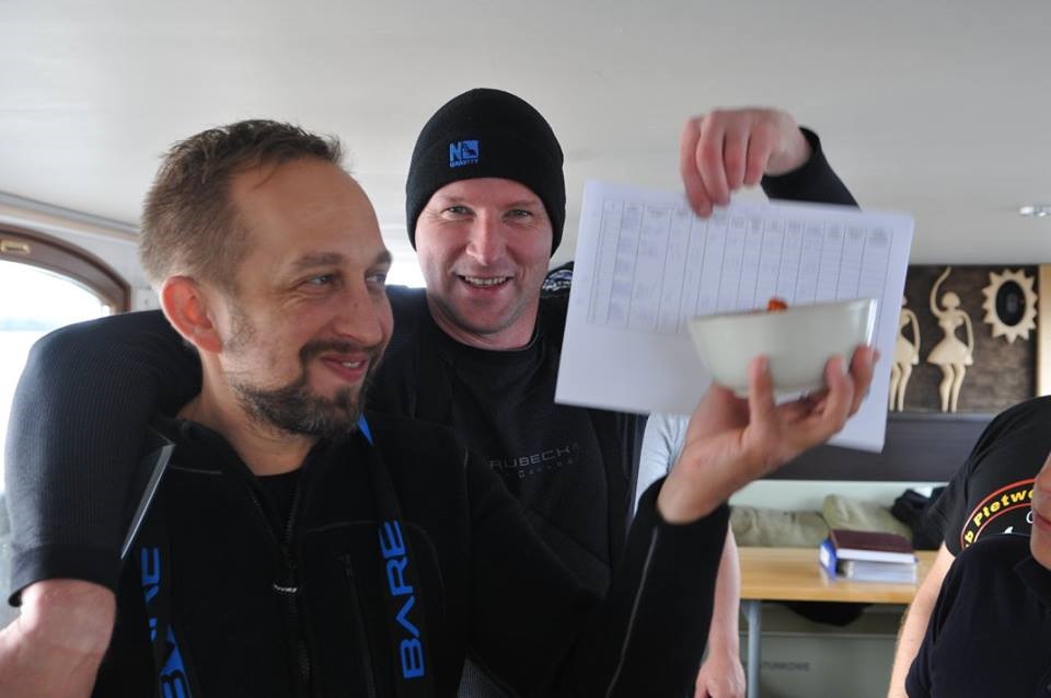 Spotkaliśmy się i rozpoczęliśmy obchody w Ekomarinie, gdzie po zaookrętowaniu na statek naszego kolegi Kostka ruszyliśmy w rejs. Nie ma co, nieobecni koledzy nad nami czuwali i pomogli nam organizując wymarzoną pogodę. Po przepłynięciu Kanałem Łuczańskim kapitan wziął kurs na Dargin i zgodnie z planem popłynęliśmy uczcić jubileusz nurkowaniem przy wyspie. Starsi koledzy bardzo szybko upewnili nas w przekonaniu, że Płetwal jest na prawdę wielki... Historie jakimi raczyli nas Ryszard Trapiszczonek, Andrzej Michniewicz, Mirek Szawiec i Andrzej Straczycki były po prostu nieprawdopodobne. Kilka z nich to właściwie tematy na sensacyjne nowele z polityczną wkładką. Wiedzieliśmy, że w klubie najwięcej "się działo" w latach 80 - tych ale historie o wyprawie Cezarego do Suwałk, załatwianiu dźwigu do podniesienia samolotu z Kisajna, odmulaniu portu Żeglugi Mazurskiej, pozyskiwaniu środków przez prace nurkowe przy wydobywaniu zatopionego drzewa, łowiectwie podwodnym, licznych wyprawach do Jugosławii i Bułgarii, opowiadane przez uczestników tych wydarzeń po prostu nas rozłożyły! Był czas się na nowo poznać. Większość obecnych klubowiczów znała najstarszych członków klubu tylko z opowieści. A tu nagle się okazało, że założyli pół wieku temu klub, mają się dobrze i są w niezłej formie. Jedną z atrakcji specjalnie dla naszych kolegów było nurkowanie w PW II Foka. Jakie było nasze zdziwienie, gdy do pomocy w ubieraniu nagle przystąpili wszyscy najbliżej stojący 70 - cio latkowie!!! I to jest właśnie partnerstwo w nurkowaniu! Natychmiast pojawiła się kolejna przezabawna historia o tym jak nurek może wyprodukować spirytus:-) Swoją drogą okazało się, że 300% normy wykonywał Mirek, który z racji postury i "łatwości" wchodzenia do foki przez kryzę szyjną potrafił to robić nawet kilkanaście razy dziennie, a co za tym idzie produkował "odkażalnika" najwięcej! Po nurkowaniu i posiłku ruszyliśmy w drogę powrotną podziwiając nasze kochane Mazury i wspominając stare dobre dzieje. Druga część obchodów rozpoczęła się o godz. 18.00 w galerii Ekomariny uroczystym otwarciem wystawy i podziękowaniami dla założycieli Płetwala oraz przybyłych gości. Na twarzach klubowiczów widać było zadowolenie, a najstarszych członków wzruszenie... Po lampce szampana była uroczysta obiadokolacja i impreza muzyczno - taneczna do samego rana.
