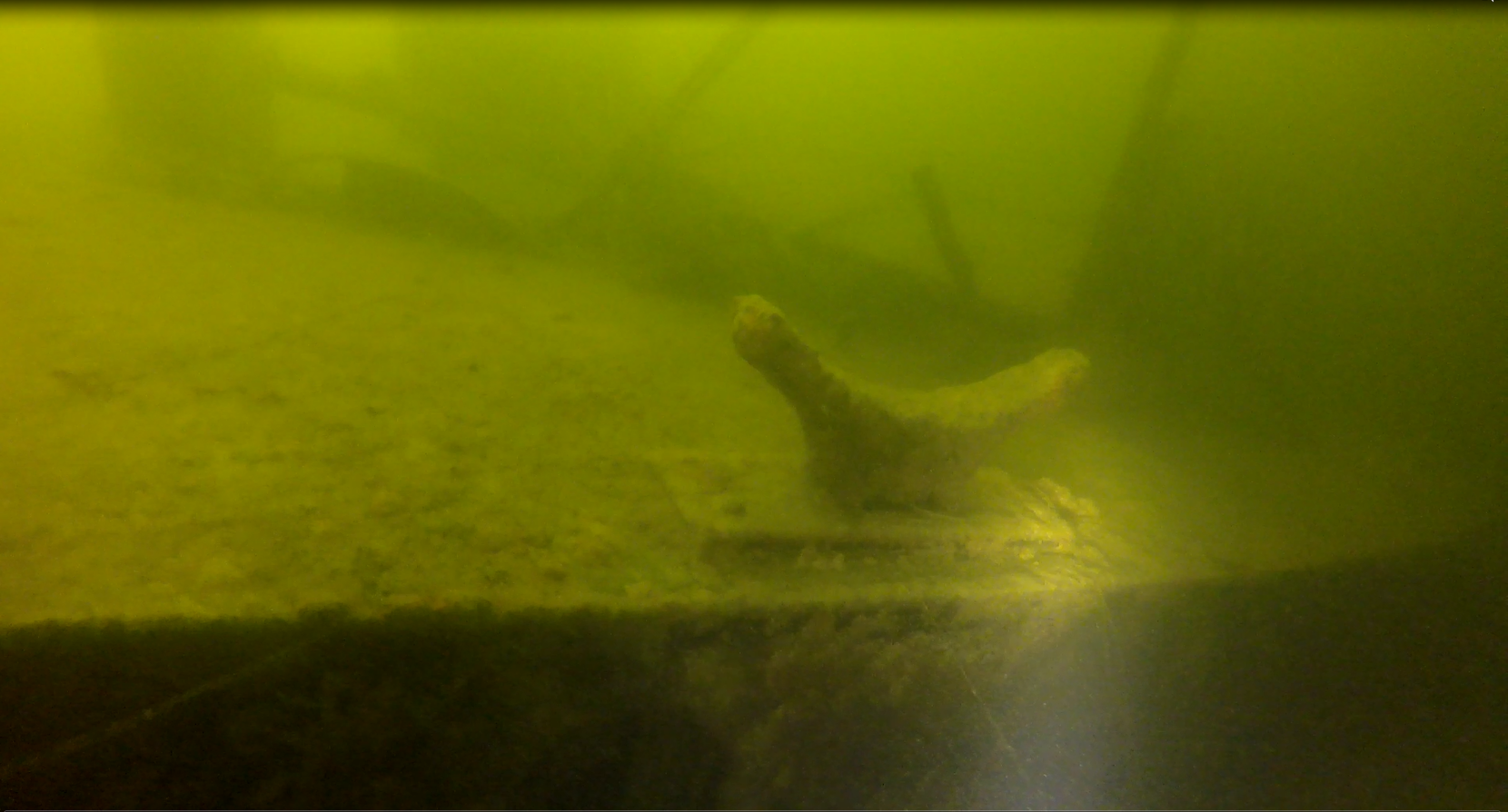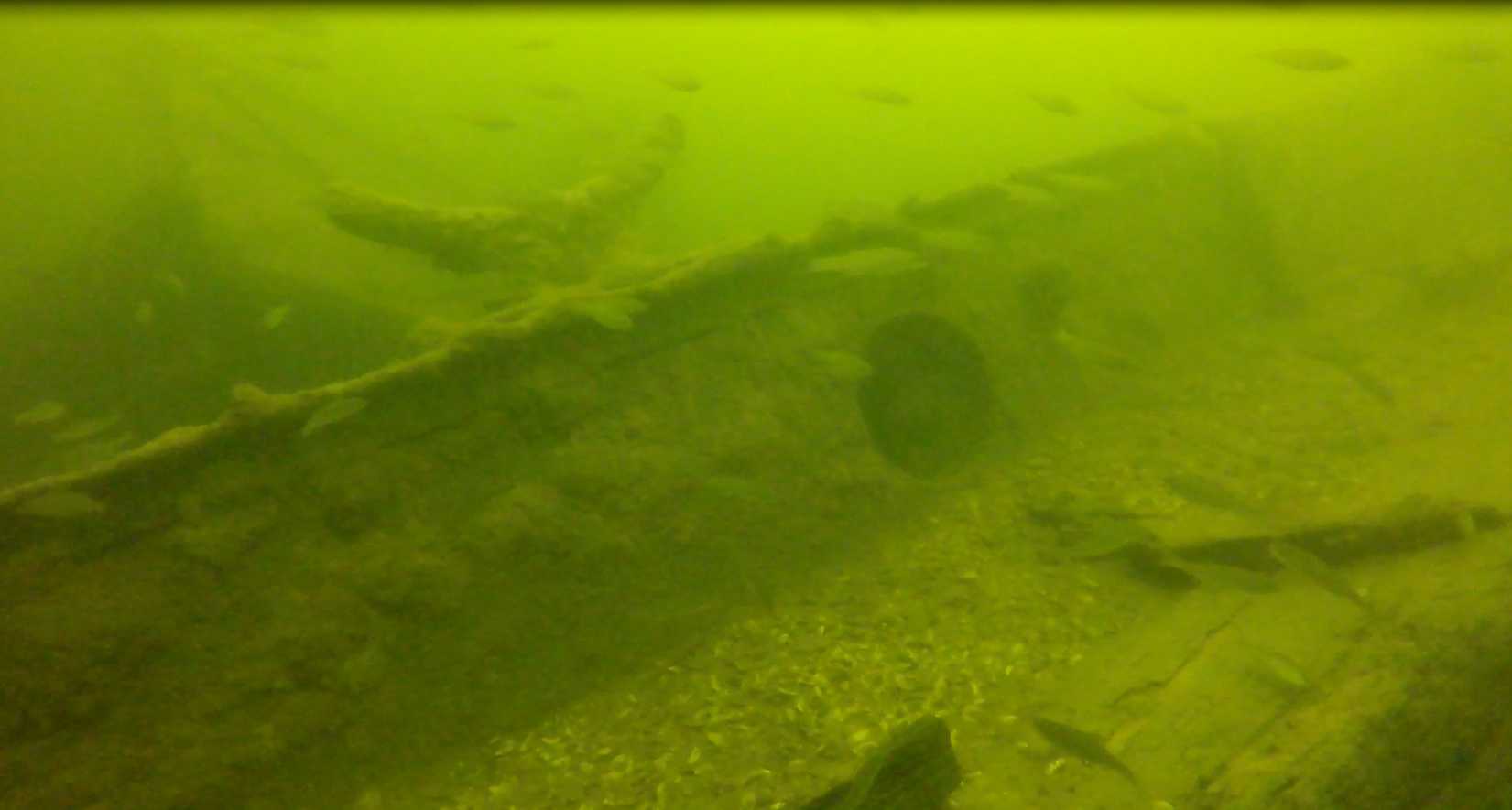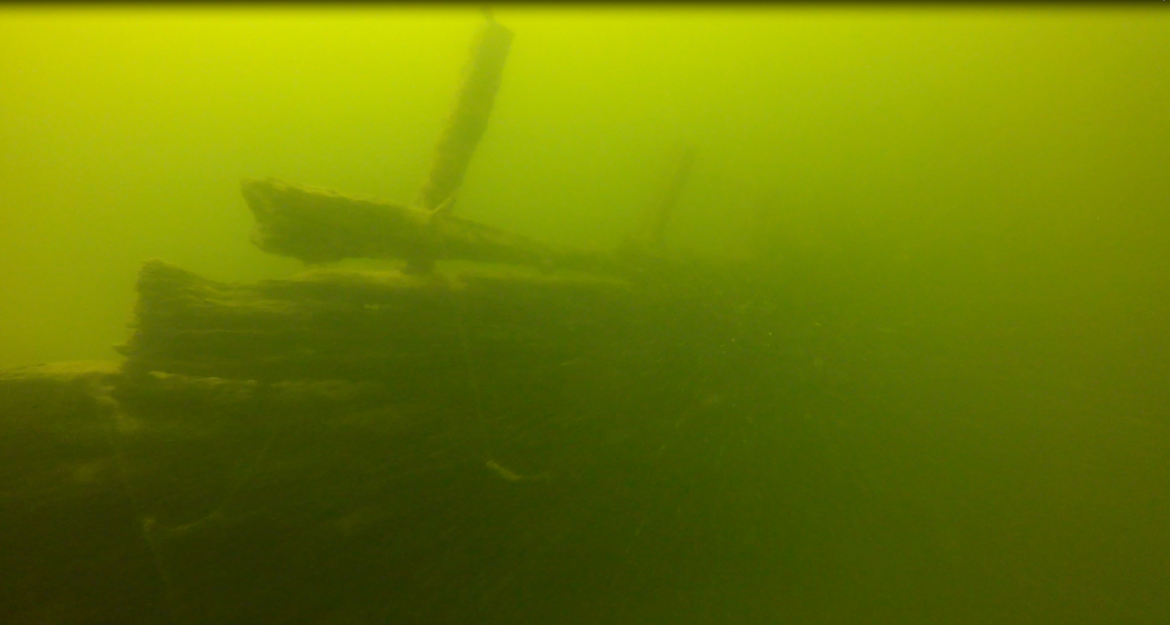 O tym, że miejsce zalegania wraku jest „komuś” znane zorientowałem się już pod wodą. Jak na miejsce zalegania, powinien być cały w żyłkach. Tymczasem żyłek było może kilka a jedynie z rufy w kierunku jeziora ciągnął się spętany warkocz siatki. Już pod wodą nie dawało mi spokoju pytanie: kto wiedział wcześniej i jak udało mu się utrzymać to w tajemnicy?