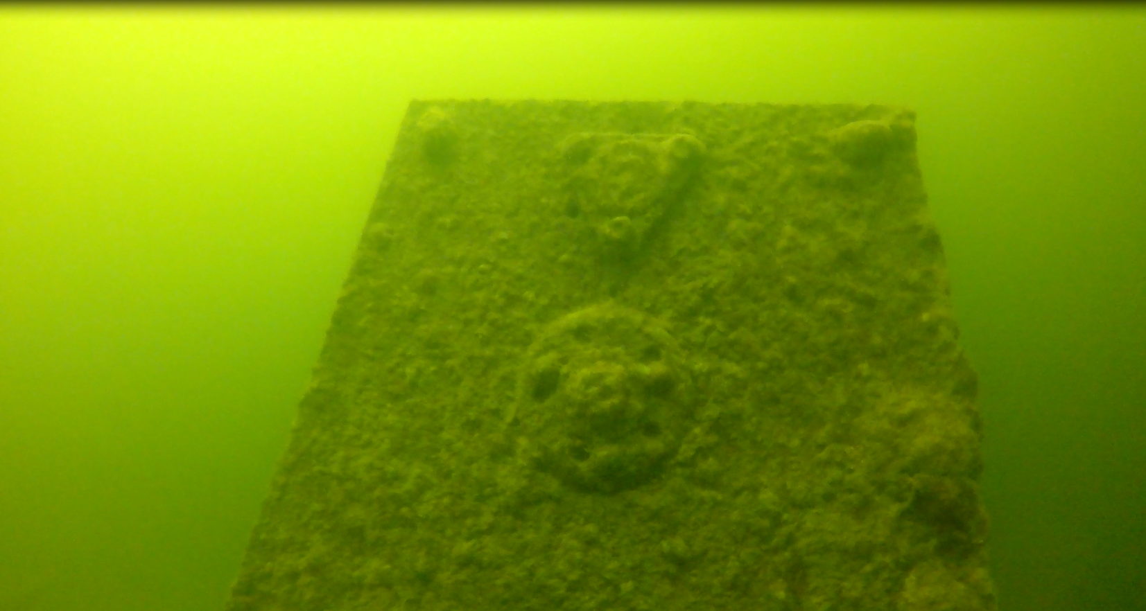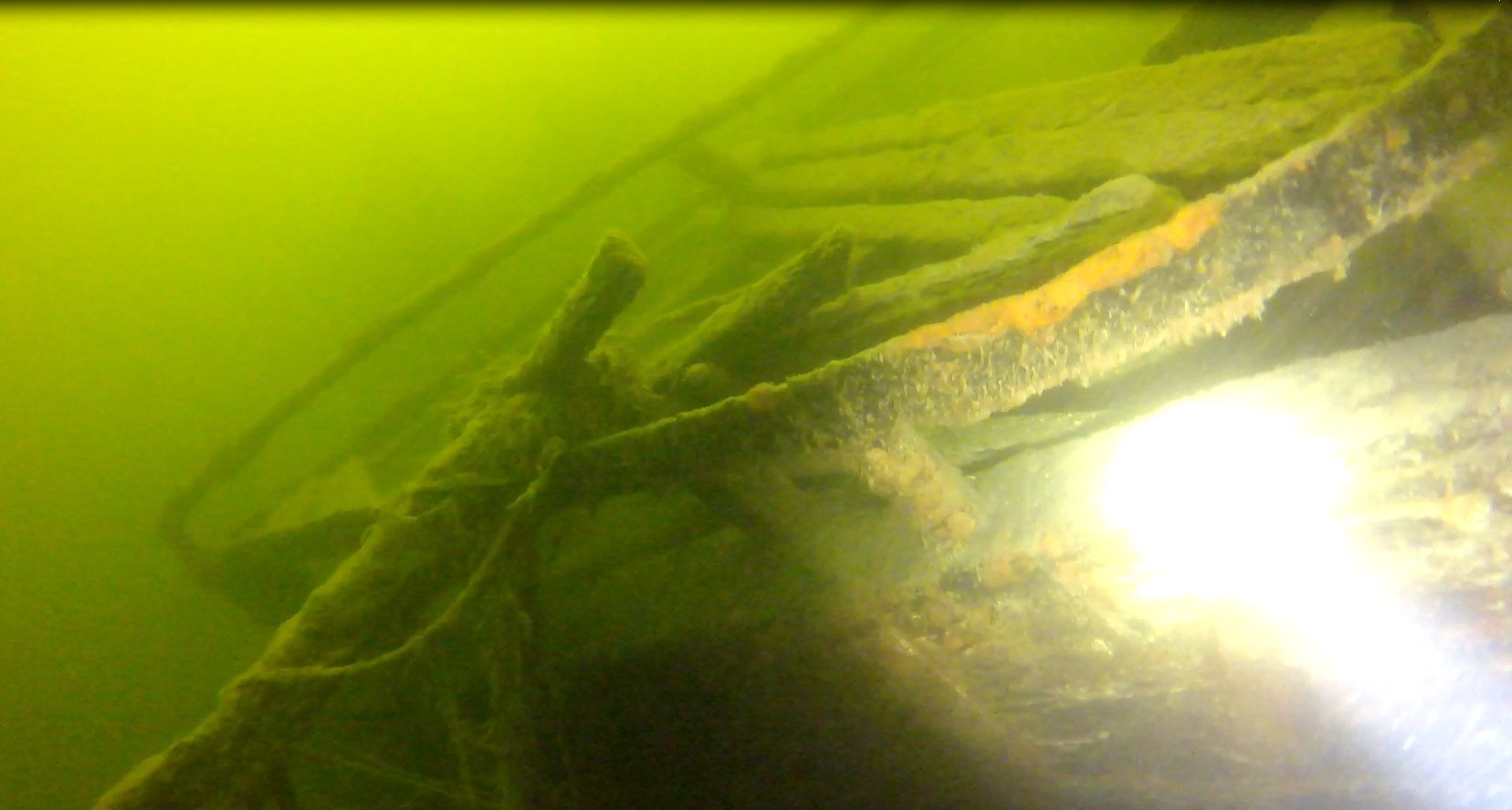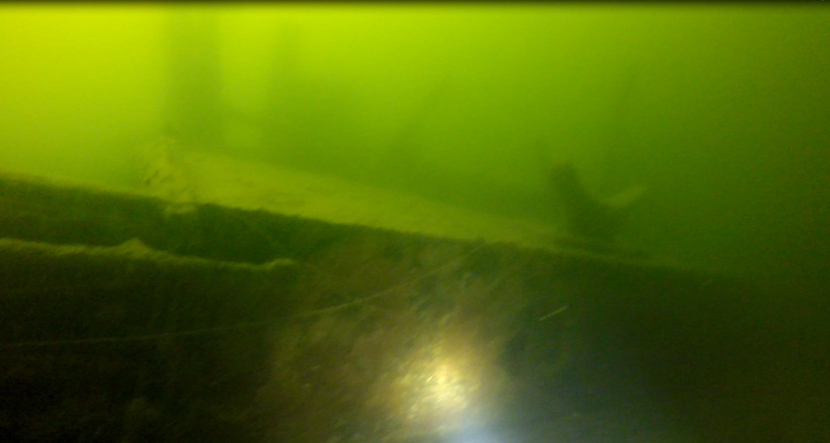 O tym, że miejsce zalegania wraku jest „komuś” znane zorientowałem się już pod wodą. Jak na miejsce zalegania, powinien być cały w żyłkach. Tymczasem żyłek było może kilka a jedynie z rufy w kierunku jeziora ciągnął się spętany warkocz siatki. Już pod wodą nie dawało mi spokoju pytanie: kto wiedział wcześniej i jak udało mu się utrzymać to w tajemnicy?