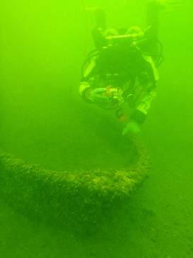 Zgodnie z planem usiłowano zidentyfikować wrak na podstawie nazwy bądź numeru. Niestety na żadnej z burt nie udało się nic odnaleźć. Maszt stoi zgodnie z informacjami uzyskanymi od strażaków. Zaskakujący jest jednak brak olinowania stałego (nie ma śladu want, sztagu, achtersztagu), którego ślady powinny pozostać na półpokładach. Świadczyć to może o celowym zatopieniu jednostki po zdjęciu z niej wszystkiego,
