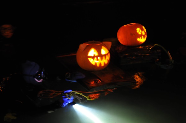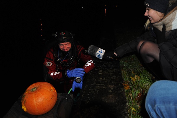 Najpierw musieliśmy przygotować nasze oryginalne boje sygnalizacyjne, zorganizować do nich podświetlenie oraz zagwarantować ich pływalność. I to było najłatwiejsze, właściwie drążenie dyni to sama przyjemność. Spotkaliśmy się zgodnie z planem przy rondzie Andrzeja Balona Tarasiewicza. W tym roku również zgodnie z planem weszliśmy do wody. I tu dopiero zaczęła się zabawa. Na powierzchni w fleszach aparatów licznie przybyłej na rozpoczęcie akcji publiczności wszyscy byliśmy uśmiechnięci. Jednak wystarczyło pierwsze 100 metrów i już wszyscy wiedzieli, że IV Mazurska Mila Nocą długo nie da o sobie zapomnieć… Lekki na pozór prąd wody w kierunku Niegocina pod mostem kolejowym sprawił, że po jego pokonaniu wszyscy byli naprawdę rozgrzani. Dobrze rokująca na starcie woda za sprawą instalacji odprowadzającej opady deszczu za mostem kolejowym przypominała rozcieńczone mleko. Jeszcze gorzej mięli nurkowie którzy płynęli z tyłu. I właśnie ten odcinek pomiędzy mostami kolejowym a obrotowym można by nazwać rozgrzewką dla ducha… Na tych którzy nie dali się pokonać prądowi i przejrzystość za mostem obrotowym czekała już coraz lepsza woda i ostatnie 1300 metrów pod wodą;-) Wszystkim, którzy zechcieli nam towarzyszyć dziękujemy. Za profesjonalną asekurację i zabezpieczenie ratownicze imprezy Mazurskiemu Ochotniczemu Pogotowiu Ratunkowemu – bardzo dziękujemy. Nurkom, którzy podjęli wyzwanie Gratulujemy – macie moc chłopaki! W tegorocznej edycji udział wzięło 12 śmiałków.
