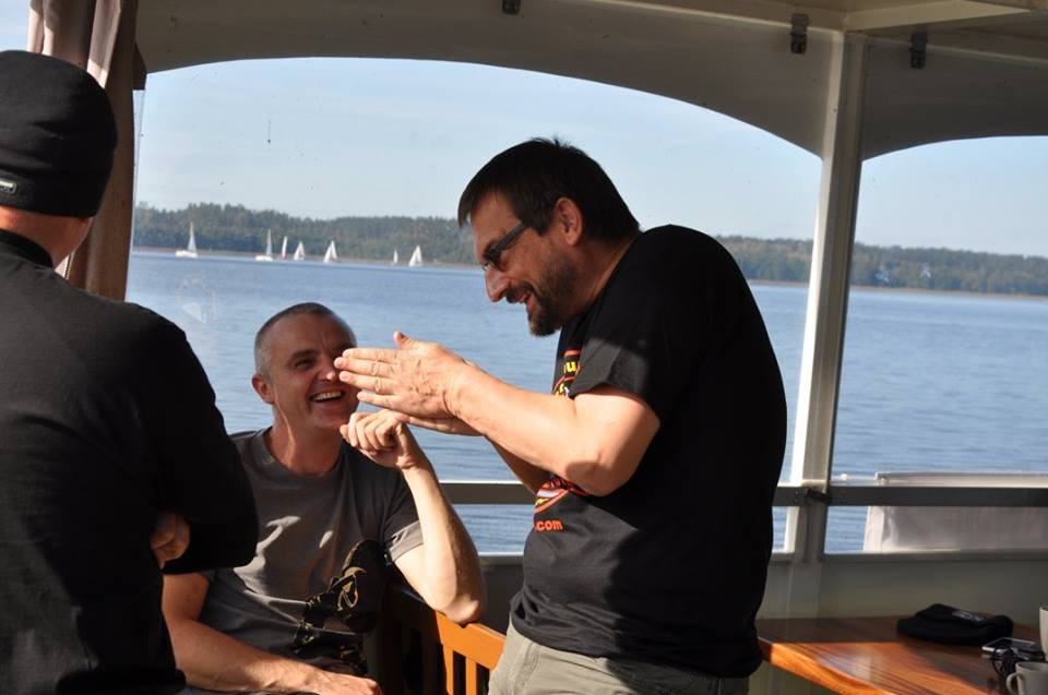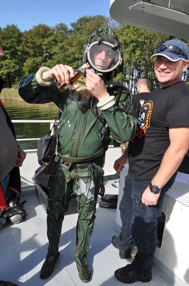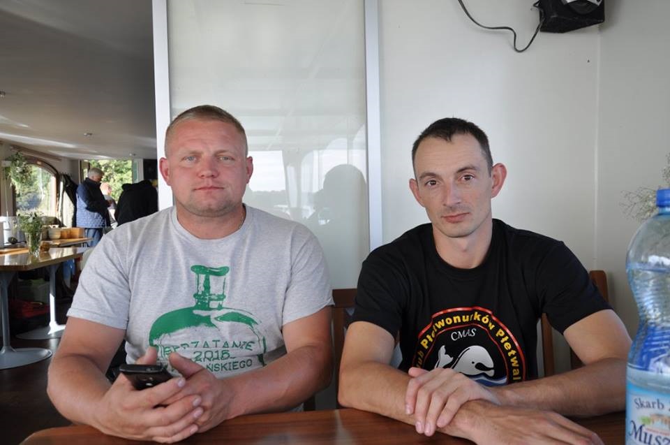 Spotkaliśmy się i rozpoczęliśmy obchody w Ekomarinie, gdzie po zaookrętowaniu na statek naszego kolegi Kostka ruszyliśmy w rejs. Nie ma co, nieobecni koledzy nad nami czuwali i pomogli nam organizując wymarzoną pogodę. Po przepłynięciu Kanałem Łuczańskim kapitan wziął kurs na Dargin i zgodnie z planem popłynęliśmy uczcić jubileusz nurkowaniem przy wyspie. Starsi koledzy bardzo szybko upewnili nas w przekonaniu, że Płetwal jest na prawdę wielki... Historie jakimi raczyli nas Ryszard Trapiszczonek, Andrzej Michniewicz, Mirek Szawiec i Andrzej Straczycki były po prostu nieprawdopodobne. Kilka z nich to właściwie tematy na sensacyjne nowele z polityczną wkładką. Wiedzieliśmy, że w klubie najwięcej "się działo" w latach 80 - tych ale historie o wyprawie Cezarego do Suwałk, załatwianiu dźwigu do podniesienia samolotu z Kisajna, odmulaniu portu Żeglugi Mazurskiej, pozyskiwaniu środków przez prace nurkowe przy wydobywaniu zatopionego drzewa, łowiectwie podwodnym, licznych wyprawach do Jugosławii i Bułgarii, opowiadane przez uczestników tych wydarzeń po prostu nas rozłożyły! Był czas się na nowo poznać. Większość obecnych klubowiczów znała najstarszych członków klubu tylko z opowieści. A tu nagle się okazało, że założyli pół wieku temu klub, mają się dobrze i są w niezłej formie. Jedną z atrakcji specjalnie dla naszych kolegów było nurkowanie w PW II Foka. Jakie było nasze zdziwienie, gdy do pomocy w ubieraniu nagle przystąpili wszyscy najbliżej stojący 70 - cio latkowie!!! I to jest właśnie partnerstwo w nurkowaniu! Natychmiast pojawiła się kolejna przezabawna historia o tym jak nurek może wyprodukować spirytus:-) Swoją drogą okazało się, że 300% normy wykonywał Mirek, który z racji postury i "łatwości" wchodzenia do foki przez kryzę szyjną potrafił to robić nawet kilkanaście razy dziennie, a co za tym idzie produkował "odkażalnika" najwięcej! Po nurkowaniu i posiłku ruszyliśmy w drogę powrotną podziwiając nasze kochane Mazury i wspominając stare dobre dzieje. Druga część obchodów rozpoczęła się o godz. 18.00 w galerii Ekomariny uroczystym otwarciem wystawy i podziękowaniami dla założycieli Płetwala oraz przybyłych gości. Na twarzach klubowiczów widać było zadowolenie, a najstarszych członków wzruszenie... Po lampce szampana była uroczysta obiadokolacja i impreza muzyczno - taneczna do samego rana.